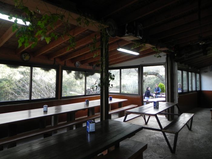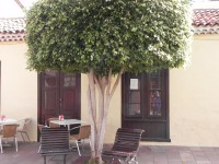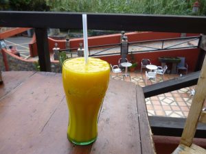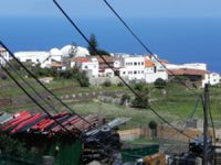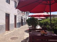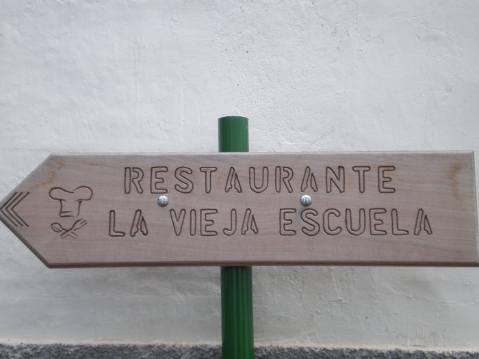 Die Vieja Escuela. Man sitzt mehr oder weniger auf der Straße, die aber keine Durchgangsstraße ist. Also ruhig. Man schaut nicht aufs Meer, sondern aufs Dorf und auf die Berge. Da oben ist der Mirador Abrante.