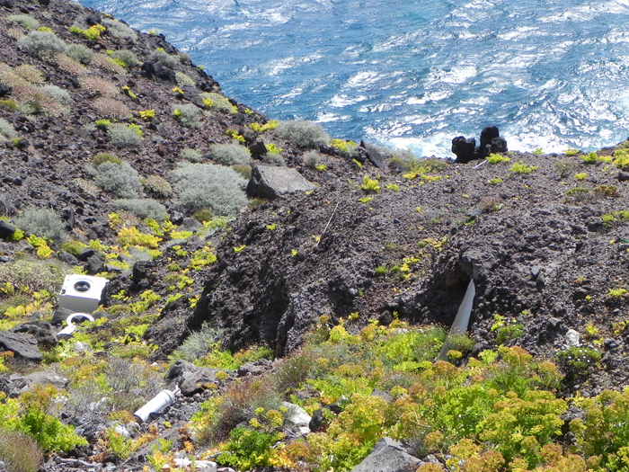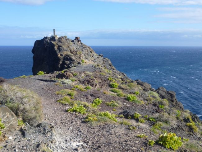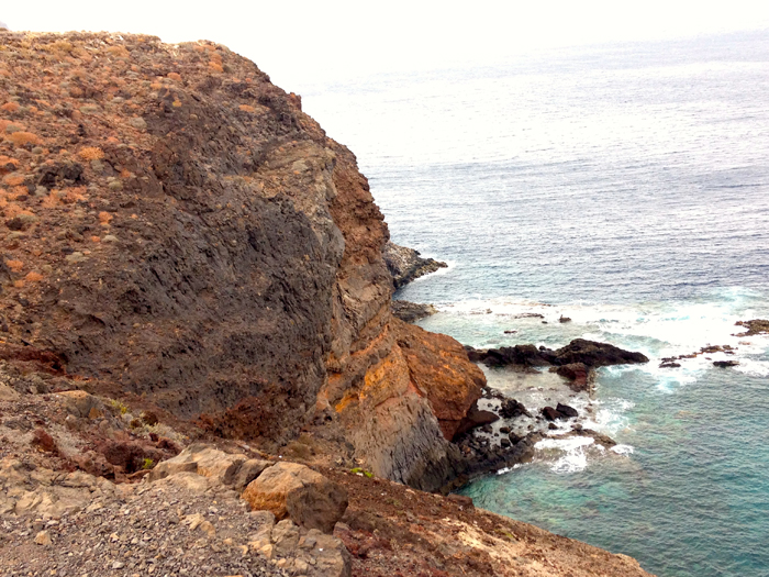 Die Küste unterhalb des Leuchtturms von San Sebastián. Die Küsten der Insel sind zum größten Teil steil. Es gibt nur wenige Badestrände. Im Norden ist im Winter das Meer zu wild, im Süden kann man auch im Winter schwimmen und im schwarzen Sand (oder auf den Steinen) liegen.