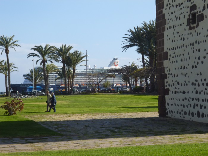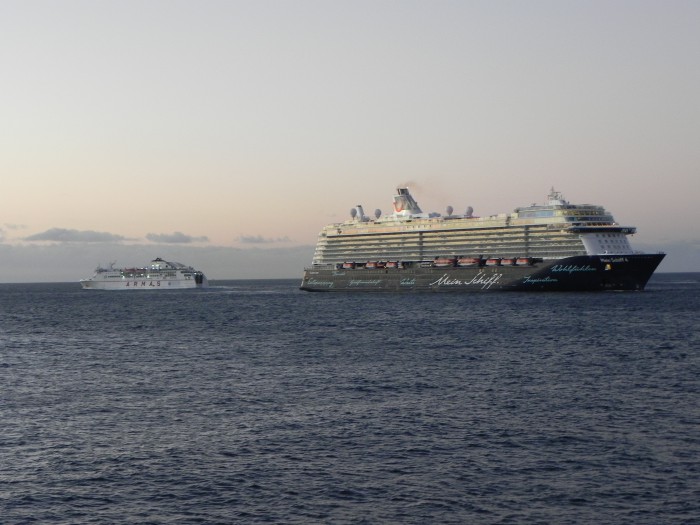 Schiff Armas 19. März 2016. Die Fähre Naviera Armas verlässt den Hafen bei Sonnenaufgang Richtung Teneriffa, MEIN SCHIFF fährt langsam ein. Hier sieht man schön den Größenvergleich. Die Fähre wirkt wie Spielzeug